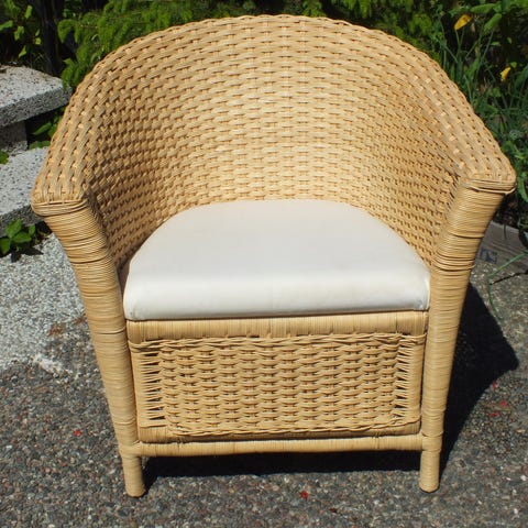 Två vita hängstolar i flätad rotting för altan eller trädgård