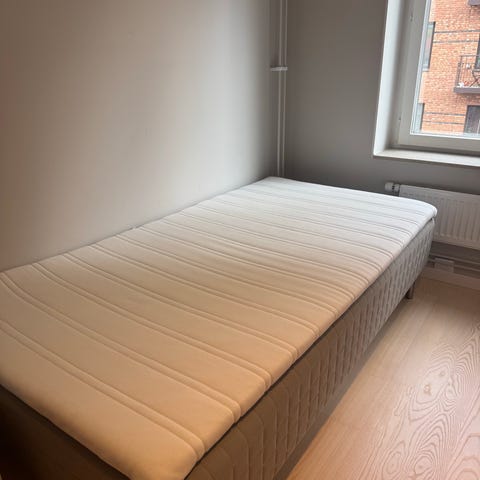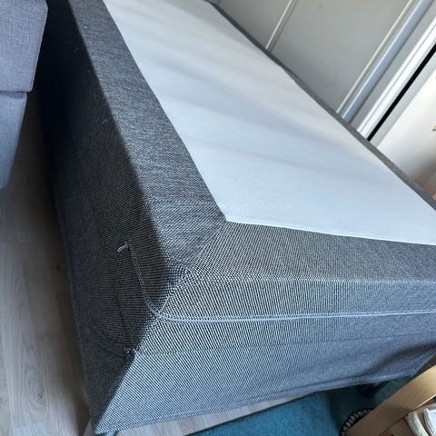 Säng från Viking Beds med mörkgrå ram och träben. Tefläck, se bild. Medium i fasthet. Köpt 2021. Hämtas senast ons.
