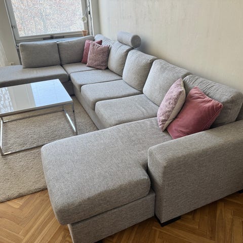 En väldigt fräsch 6-sits soffa med soffbord, varsamt använd, köpt för 2 år sen.