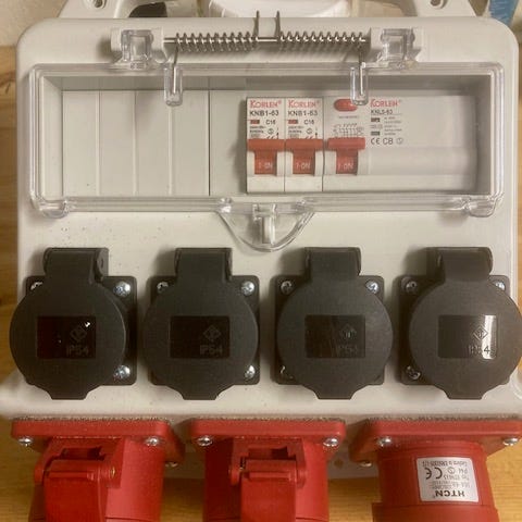El-Björn byggcentral med flera 230V- och 16A/32A-uttal samt inbyggda säkringar under genomskinligt lock. Utrustad med kraftig anslutningskabel och bärhandtag upptill.