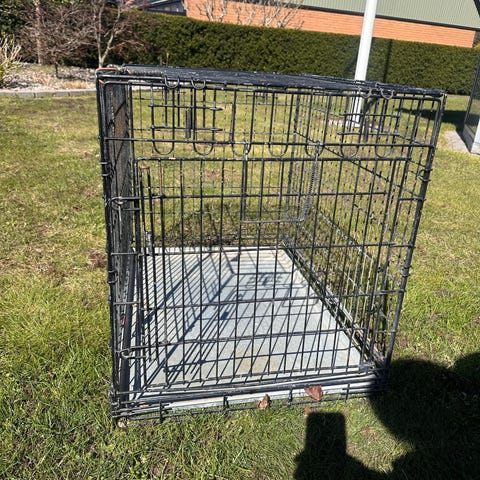 Svart ihopfällbar hundbur i metall med plastbotten