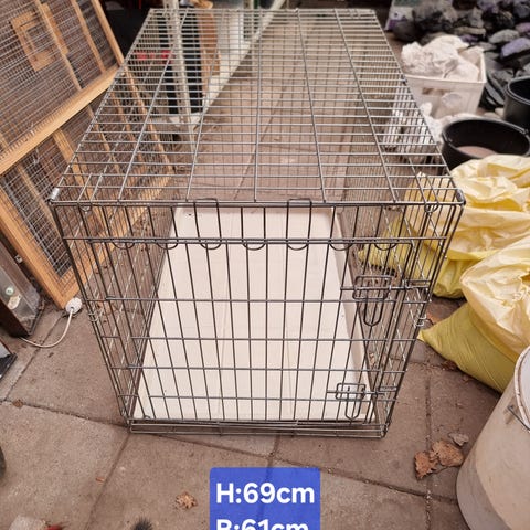 Svart hundbur i metall med löstagbar plastbotten. Har galler runtom och dörr med dubbla reglar framtill.