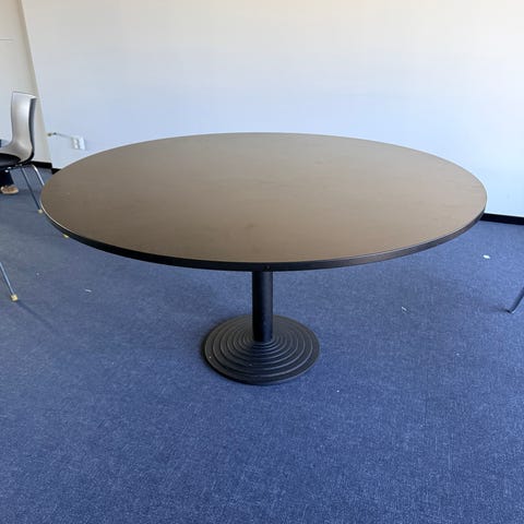 Runt svart bord. Har stabilt kryssunderrede i metall som ger bra stöd.