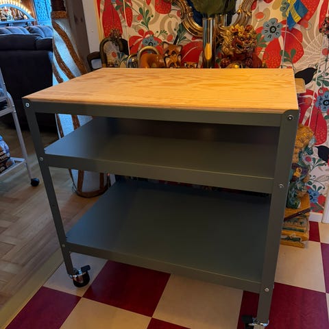 Ett rullbord från IKEA med hjul, fungerar som avlastningsbord.