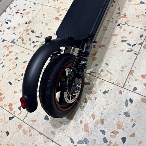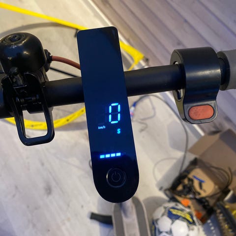 Svart elsparkcykel från Easyride med digital display på styret. Har handbroms, gasreglage och gul kabel längs ramen. Helt ny köptes 26 april