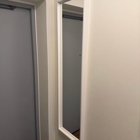 Golvspegel IKORNNES från IKEA med ram och stöd i trä. Spegeln är fristående och lätt att flytta runt i rummet.