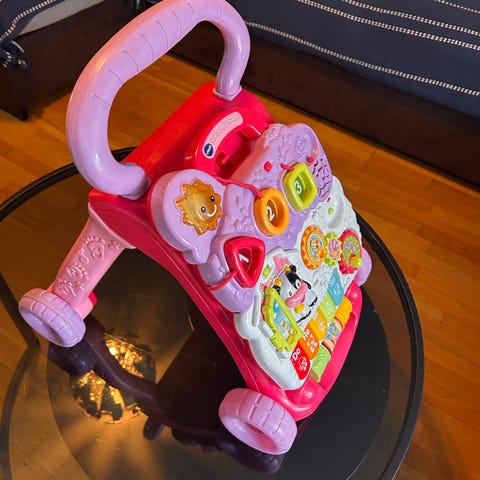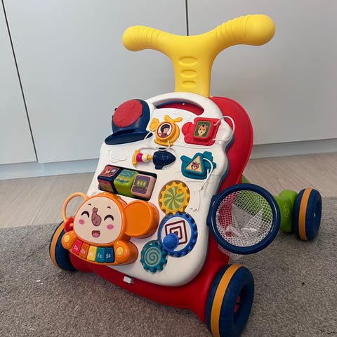 Cute wooden activity walker that helps your child take their first steps. Includes fun activities that support motor skills and sensory development. Sturdy with rubber wheels suitable for all floors. In good condition.