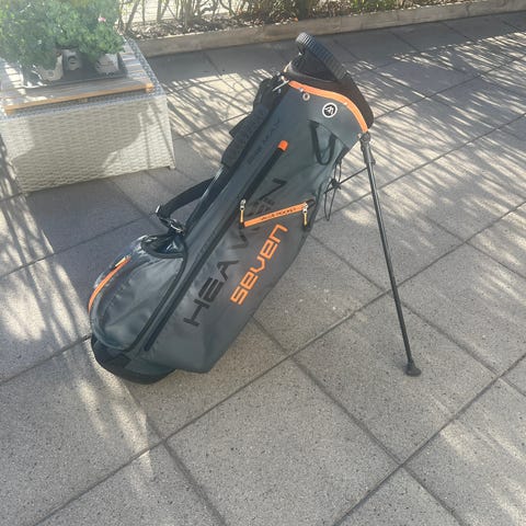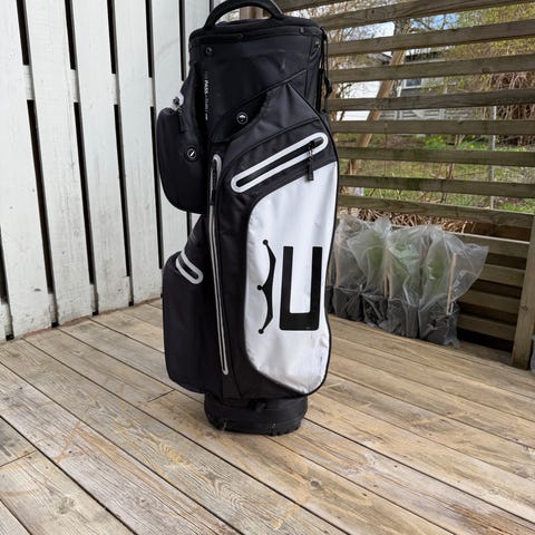 Cobra Ultradry golfbag i svart/gult med benstativ. Flera fack upptill för klubbor och flera ytterfickor samt dubbla bärremmar.