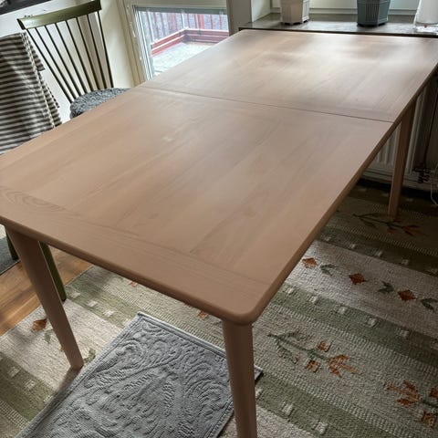 Matbord från Mio i serien Ekerö, vitpigmenterad ek. Bordet är förlängningsbart med hjälp av en butterflyskiva som förvaras under mittendelen av bordet. Bordet är 2-år gammalt. Inga direkt synliga tecken på defekter.