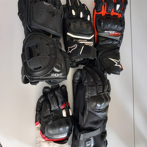 3par Svarta MC-handskar i läder och gortex med vaddering och resår vid handleden. 3 par med olika detaljer och förstärkningar på knogar och handflator. storlek 11. Vår, sommar och höst.