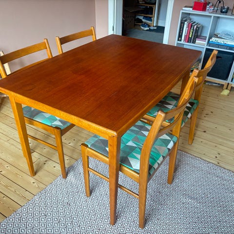 Bordet är i fint använt skick men det finns lite ytliga repor på träskivan (se bild 4)