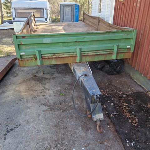1. Grå tippvagn/jordbruksvagn med höga lämmar och drag för traktor. Tvåaxlad med stora hjul och öppningsbara baklämmar, står inomhus i lada. (Bild 1, 2 och 3)