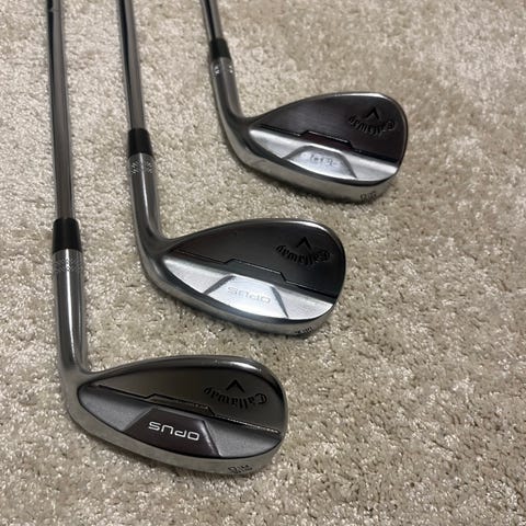 Callaway Mack Daddy 4, S grind, 54 samt 58 grader, bounce 10. Lamkingrepp i väldigt fint skick. De är i svart finish, så bilderna visar inte riktigt vilket fint skick de är i. Den svarta finishen faller lätt bort. Har använts ytterst sparsamt över ett par år. Gör ett fynd!