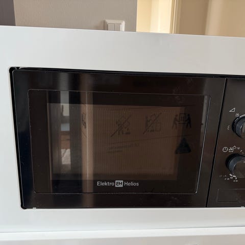 Vit mikrovågsugn från Logik med två vred för tid och effekt.