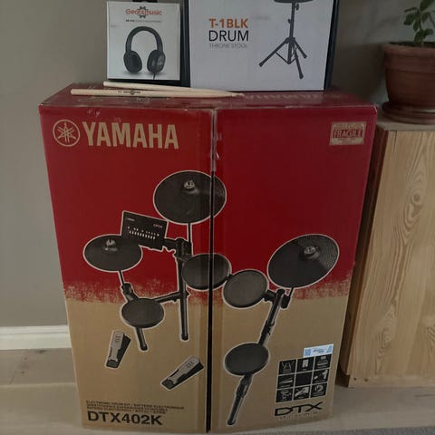 Yamaha DTX elektroniskt trumset med flera pads, cymbaler och kickpedal. Har kontrollmodul med olika ljudlägen och reglage samt stativ som är lätt att justera.