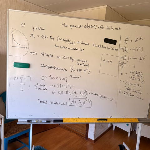 Skrivbord 220 x 80cm, kontorsstol, whiteboard 120 x 90cm, laptop Lenovo Thinkpad, extern hårddisk Seagate