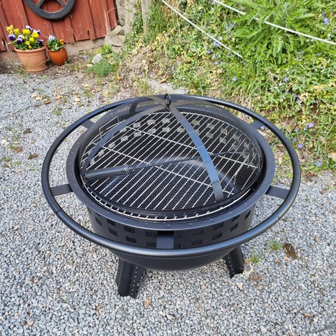 Eldstad i plåt med grillgaller och gnistkåpa. 71/73cm diameter, höjd 32cm.