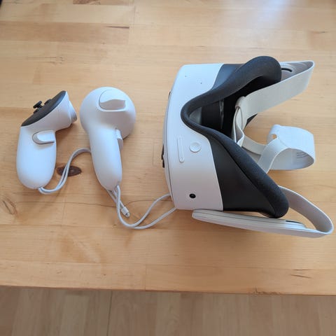Meta Quest VR-headset i vitt med justerbart huvudband. Två handkontroller och kabel syns på bilden, smidigt set för VR-spel.