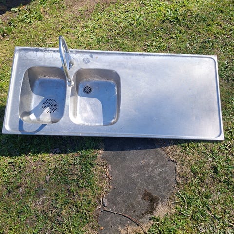 Rostfri diskbänk med dubbelho och avrinningsyta på sidan. Hål för blandare finns och några avloppsdelar följer med på köpet.