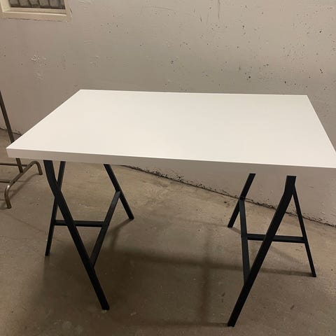 Högt vitt bord med rektangulär skiva. Har hjul på benen så det är lätt att flytta runt.