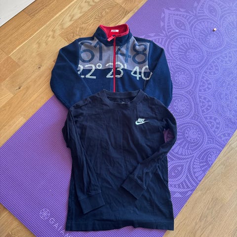 1 träningsdräkt (den bredvid sammetsdräkten) vet ej storlek, har klippt bort lappen, men ca 152-164 (150kr)
