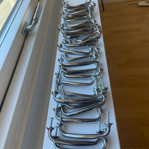 Handtag i borstad stål, 13 stycken. Ca 10,5 x 3 cm.