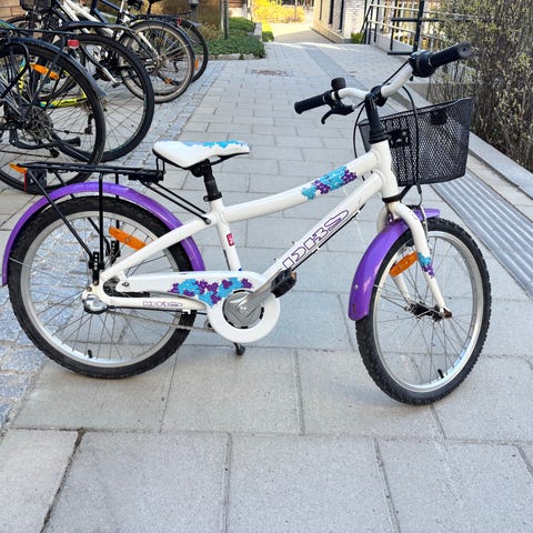 Fin Crescent barncykel med 16" hjul i vit färg med färgglada detaljer. Har korg fram, pakethållare bak, stöd och kedjeskydd.
