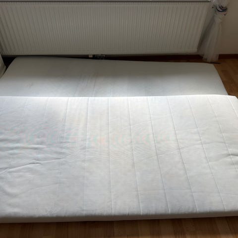 Grå madrass/bäddmadrass med quiltat överdrag. Skön att ligga på och lätt att flytta runt vid behov.