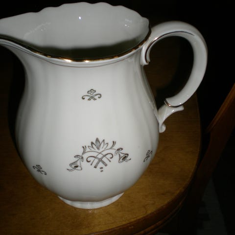 Rosa porslinskanna med reliefmönster och vit, snirklig hank samt guldkant upptill. Dekor med motiv på ena sidan och stämpel undertill, öppningen är cirka 10 cm bred.