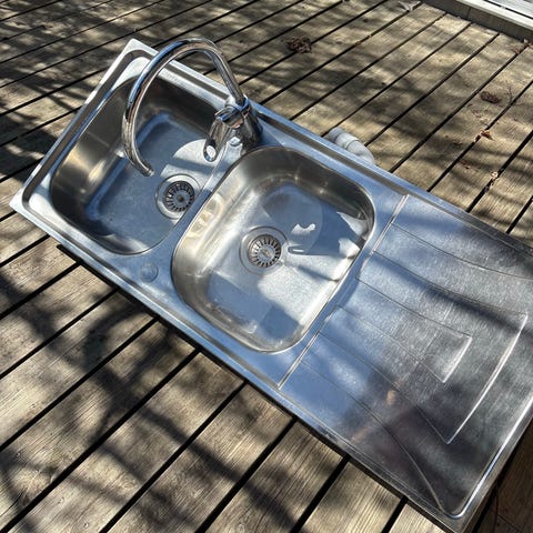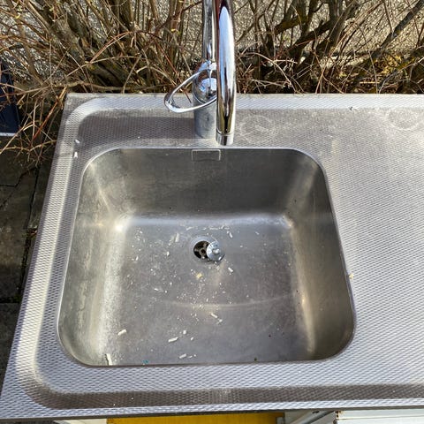 Rostfri diskho i storlek 60x60 cm från IKEA. Blandare från Mora.