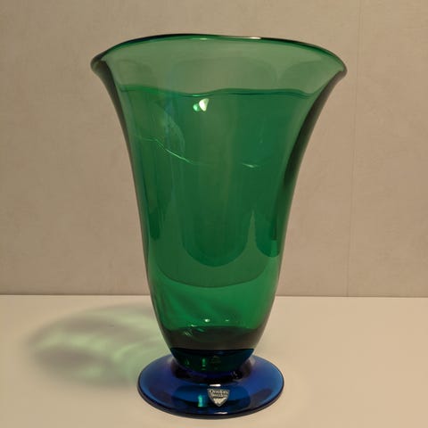 Grön/transparent Lori vas från Byon, höjd ca 30 cm med veckad kant upptill. Snygg som den är eller med blommor i på bord eller fönsterbräda. Nypris 1199kr.