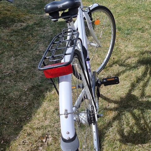 Vit landsvägscykel för kvinna i ramstorlek XL med 28" hjul. Utrustad med korg fram, pakethållare bak, navdynamo-belysning och fast lås vid bakhjulet. Cykeln behöver lite omsorg, den har stått stilla ett tag. Smörjning och luft till däcken är det första som behövs.