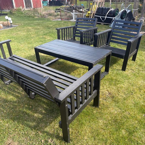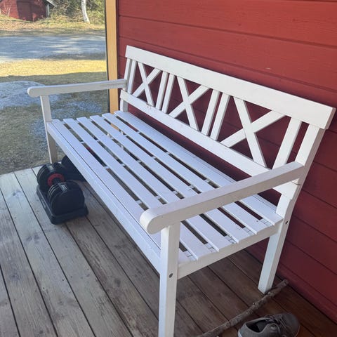 Två Trädgårdsbänkar / bänk / Utebänk i trä med ryggstöd och armstöd