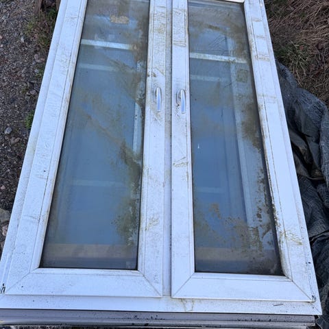 Nytt NorDan Tanum (retro) fönster med spröjs. vit trä insida, vit Alu utsida , mått 11,8 x 13 (12-13) Två öppningsbara bågar med handtag.