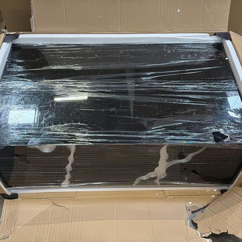 Matbord från IKEA med svart glasskiva och raka ben i metall. Passar bra som matbord eller skrivbord på balkong eller inne.