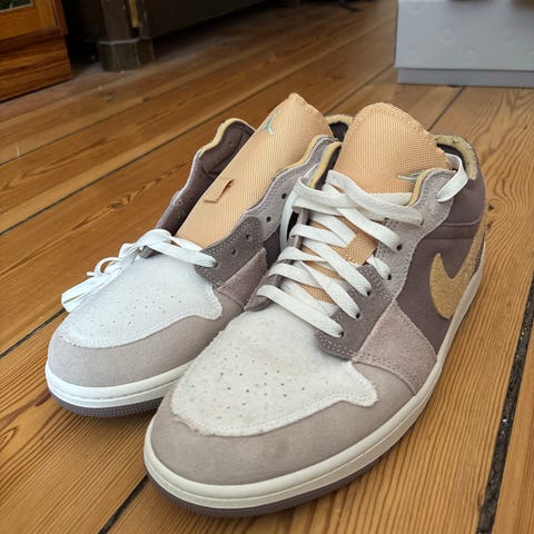 Jordan Air Jordan 1 Mid SE Craft sneakers i stl 46 med beige, brun och guldfärgade paneler och vita skosnören. Hög modell med vadderad plös och klassisk gummisula med bra mönstring.
