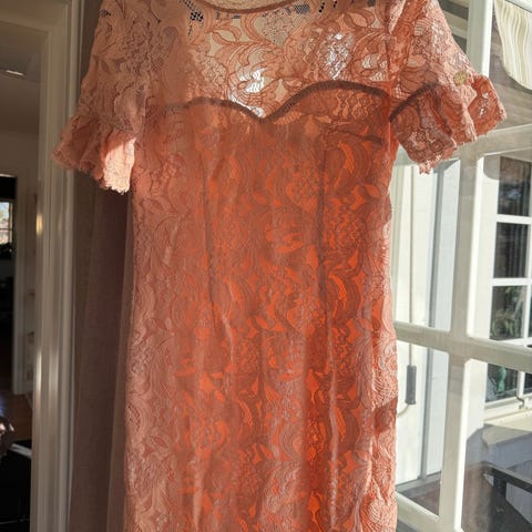 Rosa festklänning från Burberry i stl 38 med korta ärmar och spets över hela klänningen. Dragkedja bak och fodrad underklänning i samma ton.