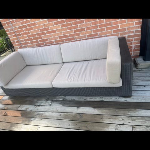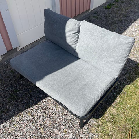 Svart utesoffa i konstrotting med ljusa sitt- och ryggdynor. Bekväm modell med plats för flera personer, passar bra på altan eller balkong.