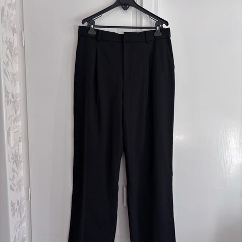 Svarta byxor från Lindex i stl 40, lite bootcut/flare och enkel modell i polyester. Har hällor för skärp och stängs med dragkedja och knapp framtill.
