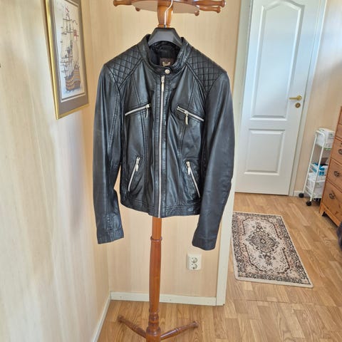 Beige damjacka i stl 36 med dragkedja och snedställda fickor fram. Har detaljer på axlarna och knappar vid kragen för lite motorcykelstil.