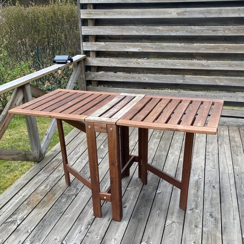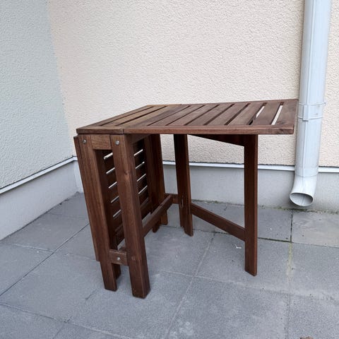 Hopfällbart bord i mörkbrunt trä som passar bra på altan eller balkong. Bordet har ribbad skiva och båda sidorna går att fälla upp eller ner efter behov.