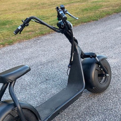 Elektrisk fatbike-scooter i svart med breda däck och låg ståplatta. Har sadel, stöd och laddkontakt vid sidan.