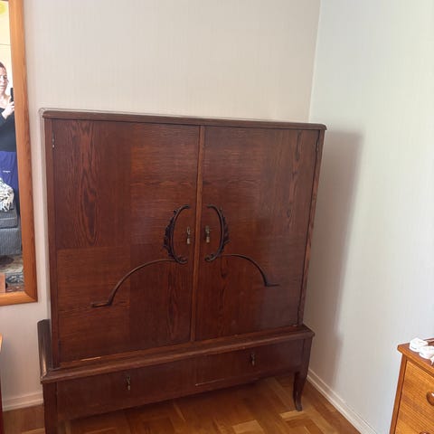 Skåpet är i massivt trä och har med åren fått en del repor som syns på bilderna. Lås saknas på en av underskåpsluckorna.