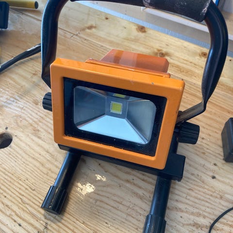 Arbetslampa från Malmbergs, modell QH-505 på max 500W med bygelstativ. Har galler framför glaset och strömkabel med stickkontakt.