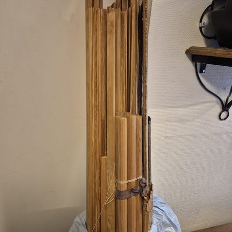 Bruna bambupersienner/rullgardiner med snören för upp- och nedrullning. Tre stycken i samma stil, rullade ihop och klara att hängas upp.