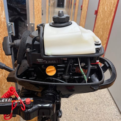 Mercury 6 hk utombordare med rorkult och inbyggd tank. Lätt att bära och montera på mindre båt. Sparsamt använd 4 år gammal.