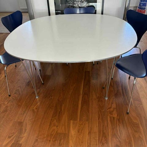 Matbord Supercirkel av Bruno Mathsson med vit skiva och metallben. Snyggt bord som rymmer flera stolar runt om ( 8 skulle jag säga).