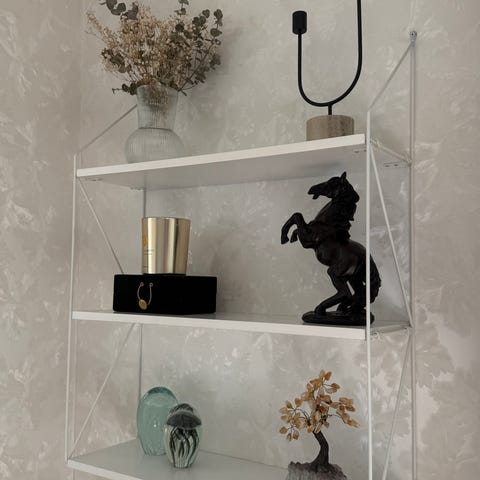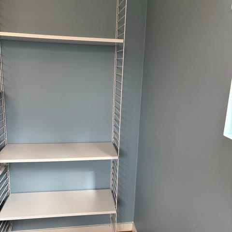 Stilren vägghylla i klassisk String-design med tre hyllplan i trä och vita metallgavlar. Stabil och funktionell, passar perfekt i vardagsrum, hall eller barnrum.
