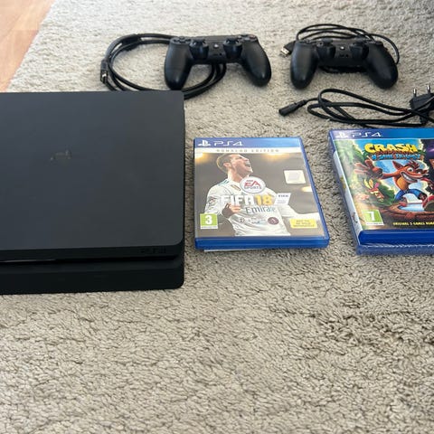 Säljer mitt PS4 Slim-paket. Allt fungerar perfekt, konsolen är fabriksåterställd och uppdaterad — koppla in och kör direkt.