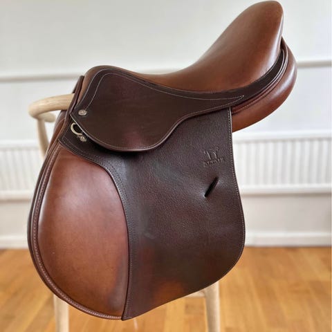 Välskött Prestige Versailles hoppsadel i brunt läder. Storlek 16” med bomvidd 33. En kvalitetsadel som passar både hoppning och allroundridning.